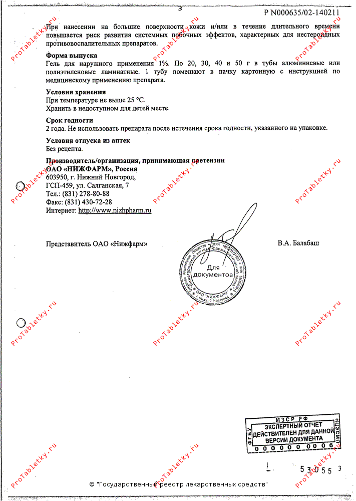 Вспомогательные вещества: молочная кислота 40% - 0.11 г, изопропанол (2-пропанол) - 15 г, этанол (спирт этиловый ректификованный) - 15 мг, натрия дисульфит (натрия метабисульфит) - 0.05 г, карбомер (карбопол) - до 1.5 г, троламин (2,2',2''-нитрилотриэтанол) - до 3 г (для получения геля с pH от 7.0 до 8.5), вода (вода очищенная) - до 100 г.