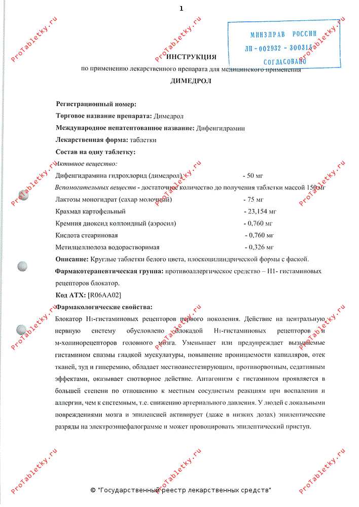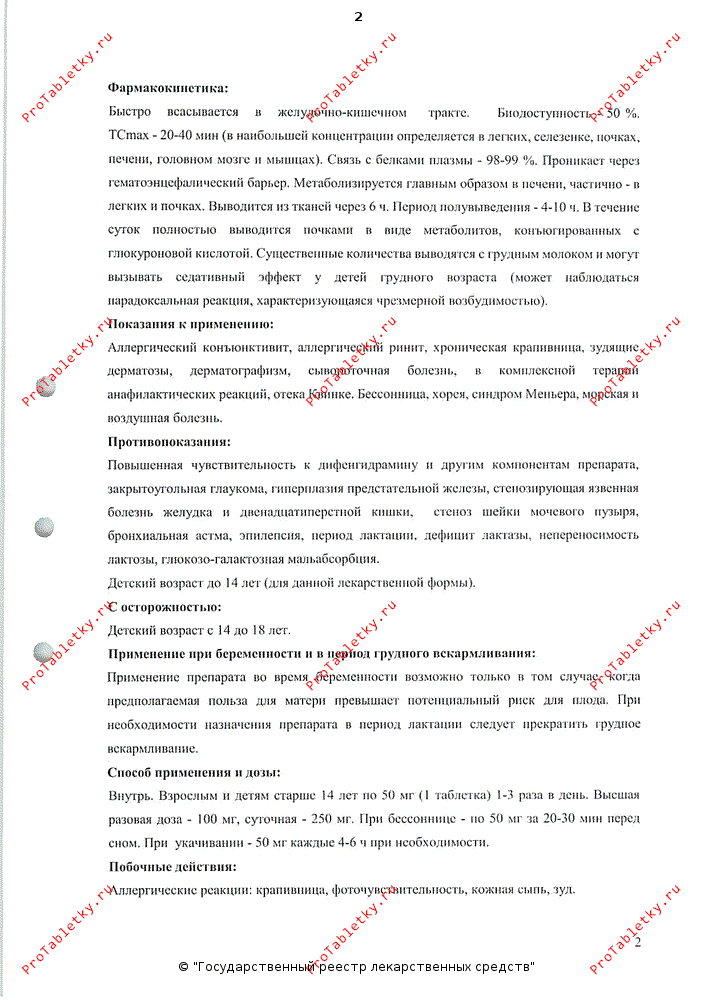 Пиковая концентрация отмечается через 1-4 часа после перорального приема. Большая часть активного компонента подвергается метаболическим трансформациям в печени. Период полужизни препарата составляет 1-4 часа. Выделяется в грудное молоко и может вызвать снотворный эффект у детей, находящихся на грудном вскармливании. Фармакологический эффект достигает максимальной выраженности через 1 час после перорального приема. Продолжительность действия составляет в среднем 4-6 часов. Кратность применения – 1-3 раза в день, продолжительность медикаментозного курса – 10-15 дней. Пациентам с гиперактивностью щитовидной железы, повышенным давлением жидкости внутри глаза, кардиоваскулярной патологией, а также лицам пожилого возраста при приеме препарата следует соблюдать особую осторожность. Димедрол противопоказан лицам, чья работа связана с повышенной концентрацией внимания (в т.ч. водителям). Во время медикаментозного курса необходимо воздерживаться от потребления алкоголя. Димедрол не используется при индивидуальной непереносимости, в период беременности и грудного вскармливания, при закрытоугольной глаукоме, аденоме предстательной железы, пилородуоденальном стазе. Димедрол потенцирует ингибирующие эффекты на ЦНС снотворных средств, транквилизаторов, этанола. Наиболее распространенные побочные эффекты: слабость разбитость, седация, вертиго, сонливость, головные боли, ухудшение когнитивных функций.