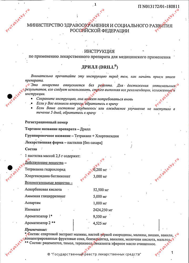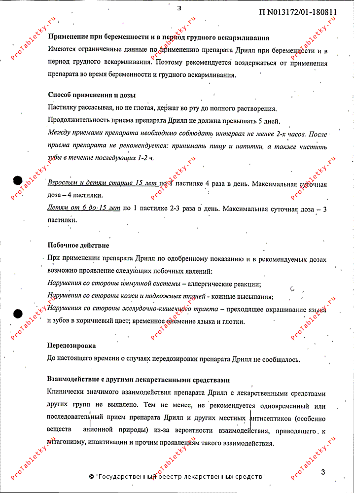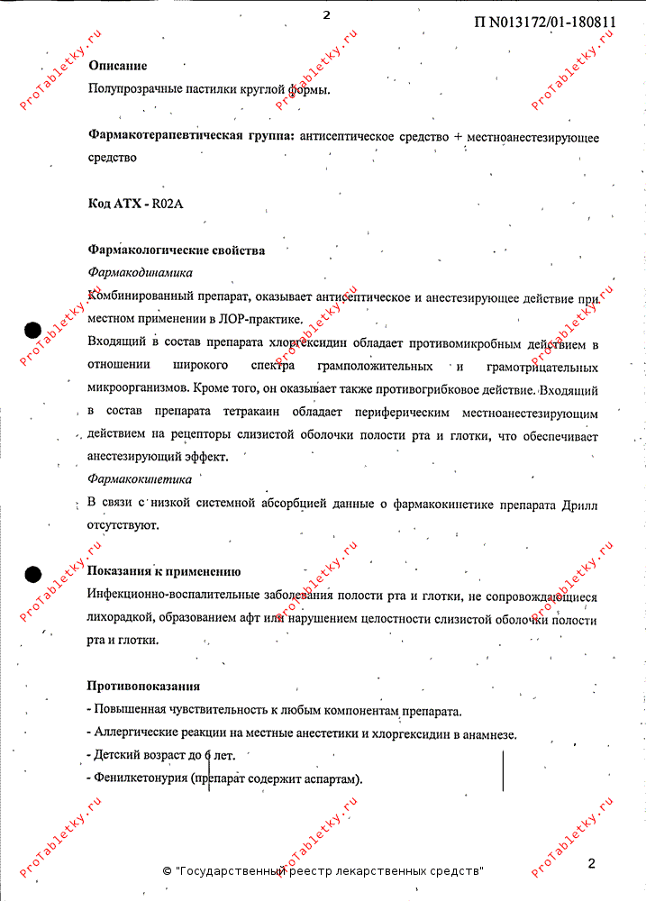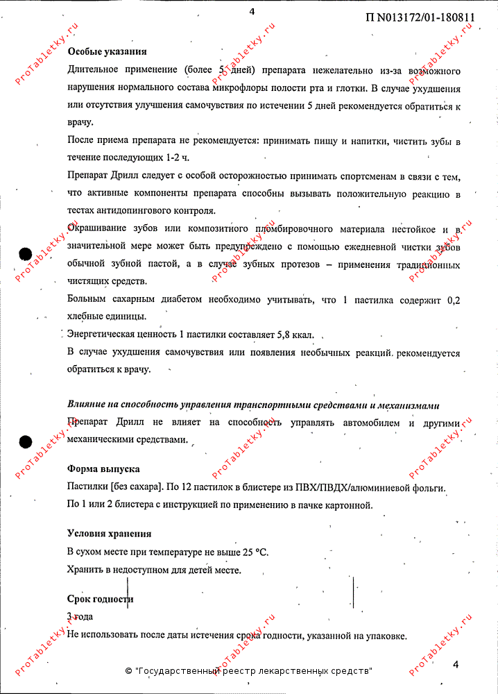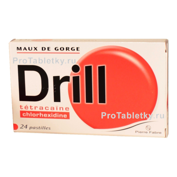 Пастилку рассасывая, но не глотая, держат во рту до полного растворения. Продолжительность приема препарата Дрилл не должна превышать 5 дней. Между приемами препарата необходимо соблюдать интервал не менее 2-х часов. После приема препарата не рекомендуется: принимать пищу и напитки, а также чистить зубы в течение последующих 1-2 ч.