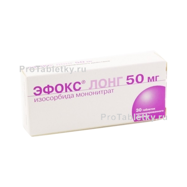Эфокс лонг (МНН изосорбид-5-мононитрат) – периферическое сосудорасширяющее лекарственное средство, относящееся к группе органических нитратов. Действует преимущественно на сосуды венозного русла. Снижает потребность сердечной мышцы в поступлении кислорода за счет уменьшения величины конечно-диастолического давления, создаваемого наполнением желудочка (увеличение просвета периферических вен и уменьшение кровенаполнения правого предсердия) и давления в артерии, выходящей из желудочка (снижение общего сопротивления всей сосудистой системы выбрасываемому сердцем потоку крови). Увеличивает просвет коронарных артерий. Перераспределяет кровоток в кровеносных сосудах миокарда в области с пониженной циркуляцией крови. Улучшает переносимость физической нагрузки у пациентов, страдающих ишемической болезнью, стенокардией. При неспособности сердца перекачивать объем крови, необходимый для обеспечения метаболических потребностей организма способствует разгрузке сердечной мышцы за счет уменьшения величины конечно-диастолического давления, создаваемого наполнением желудочка. После перорального приема быстро и в полном объеме всасывается из гастроинтестинального тракта. Подвергается метаболическим трансформациям в печени. Образовавшиеся метаболиты фармакологической активностью не обладают. Элиминация из организма осуществляется вместе с мочой. Период полужизни – 4-5 часов. Доза лекарственного средства определяется в индивидуальном порядке. Разовая доза варьируется в диапазоне от 10 до 100 мг. Кратность приема и продолжительность медикаментозного курса определяются показаниями, эффективностью и переносимостью пациентом проводимого лечения. Возможные нежелательные побочные реакции: «нитратная» цефалгия (в большинстве случаев проходит через несколько дней после начала медикаментозного курса), гипотония, вертиго, учащенное сердцебиение, слабость, потенцирование признаков стенокардии (в редких случаях при выраженном снижении артериального давления), тягостное ощущение в подложечной области, груди, полости рта и глотке, предшествует рвоте, преходящая гиперемия кожных покровов, психомоторное торможение.