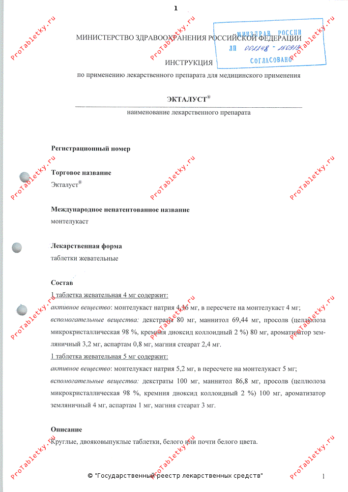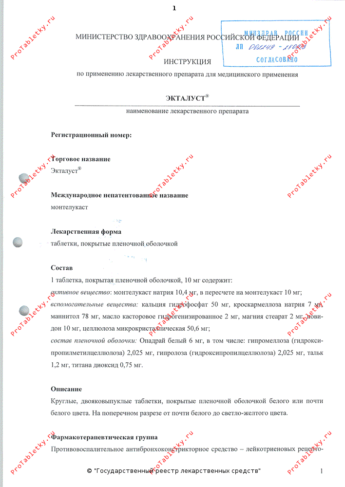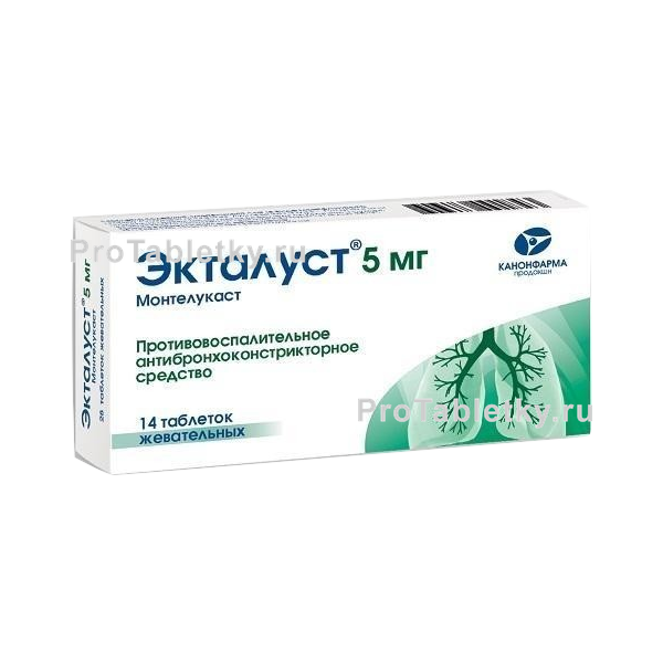 Бронходнлататоры: Экталуст® можно добавлять к лечению пациентов, у которых астма не контролируется применением одних бронходилататоров. При достижении терапевтического эффекта (обычно после первой дозы) на фоне терапии препаратом Экталуст® дозу бронходилататоров можно постепенно снижать.