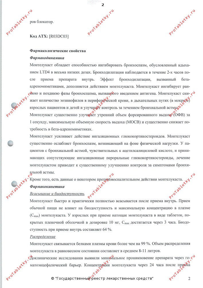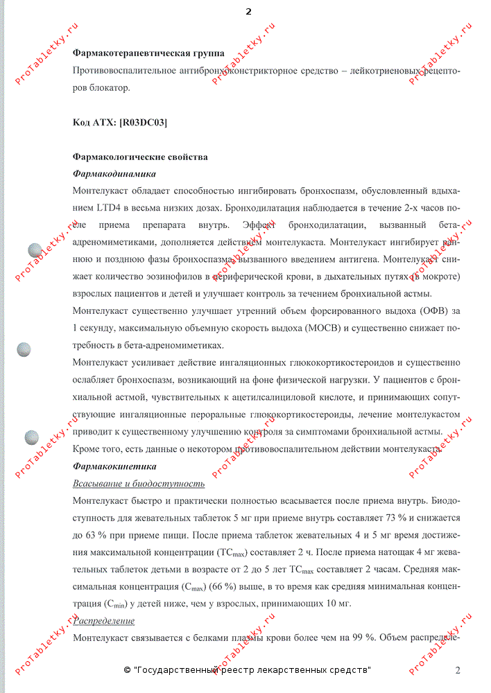 Монтелукаст быстро и практически полностью всасывается после приема внутрь. Биодоступность для жевательных таблеток 5 мг при приеме внутрь составляет 73% и снижается до 63% при приеме пищи. После приема таблеток жевательных 4 и 5 мг время достижения Cmax (ТCmax )составляет 2 ч. После приема натощак 4 мг жевательных таблеток детьми в возрасте от 2 до 5 лет ТCmax составляет 2 ч. Средняя Cmax (66%) выше, в то время как Cmin у детей ниже, чем у взрослых, принимающих 10 мг.