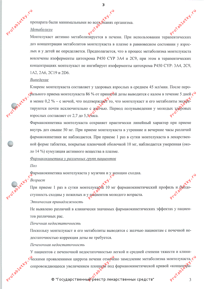 Поскольку монтелукаст и его метаболиты не экскретируются с мочой, фармакокинетика монтелукаста у пациентов с почечной недостаточностью не оценивалась. Корректировка дозы препарата для этой группы пациентов не требуется.