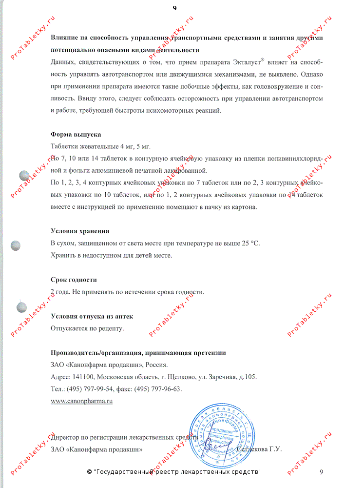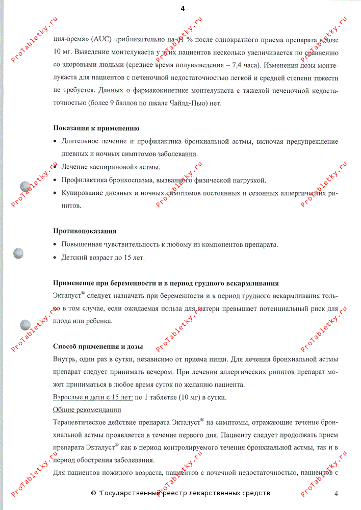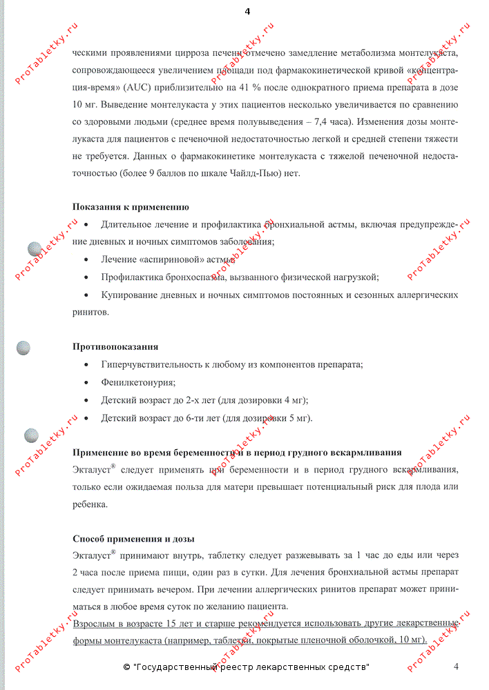 Эффективность препарата Экталуст® для приема внутрь в отношении лечения острых приступов бронхиальной астмы не установлены, поэтому препарат Экталуст® в таблетках не рекомендуется назначать для лечения острых приступов бронхиальной астмы. Препарат Экталуст® не должен заменять ингаляционные или пероральные ГКС.