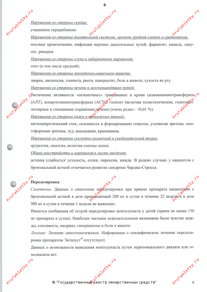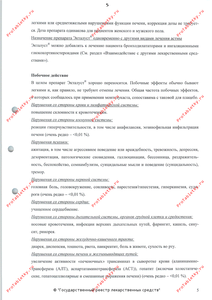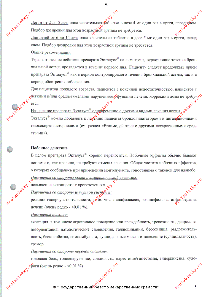 В целом препарата Экталуст® хорошо переносится. Побочные эффекты обычно бывают легкими и, как правило, не требуют отмены лечения. Общая частота побочных эффектов, о которых сообщалось при применении монтелукаста. сопоставима с таковой для плацебо:.