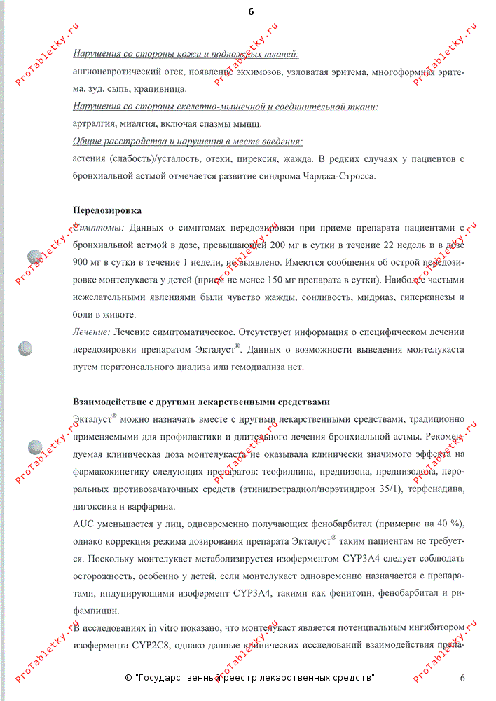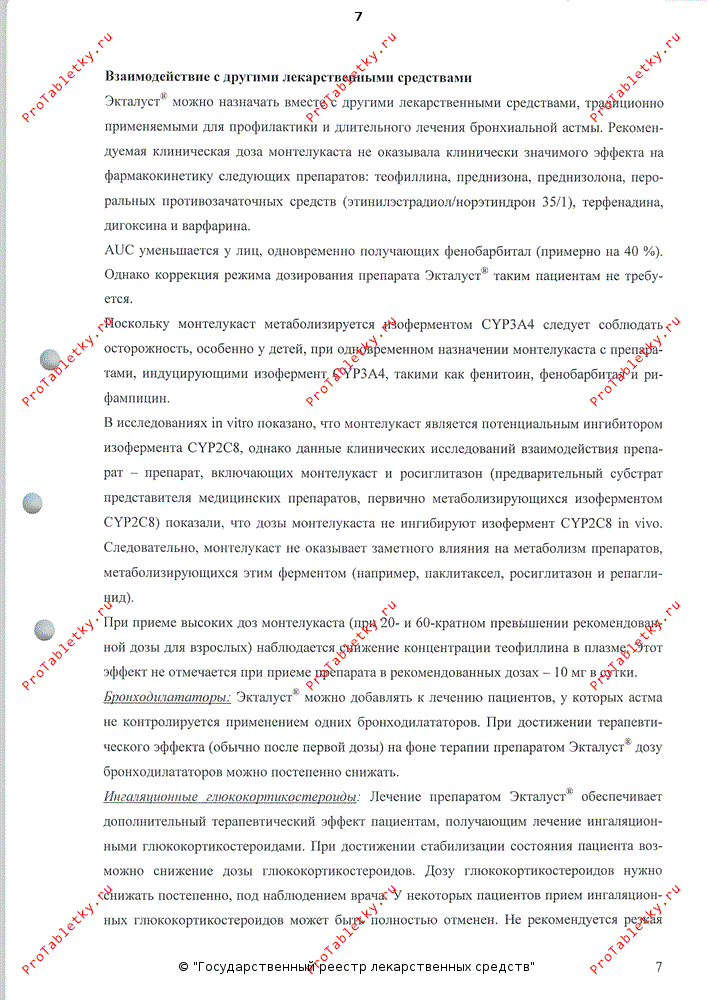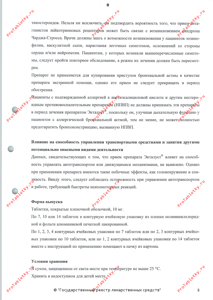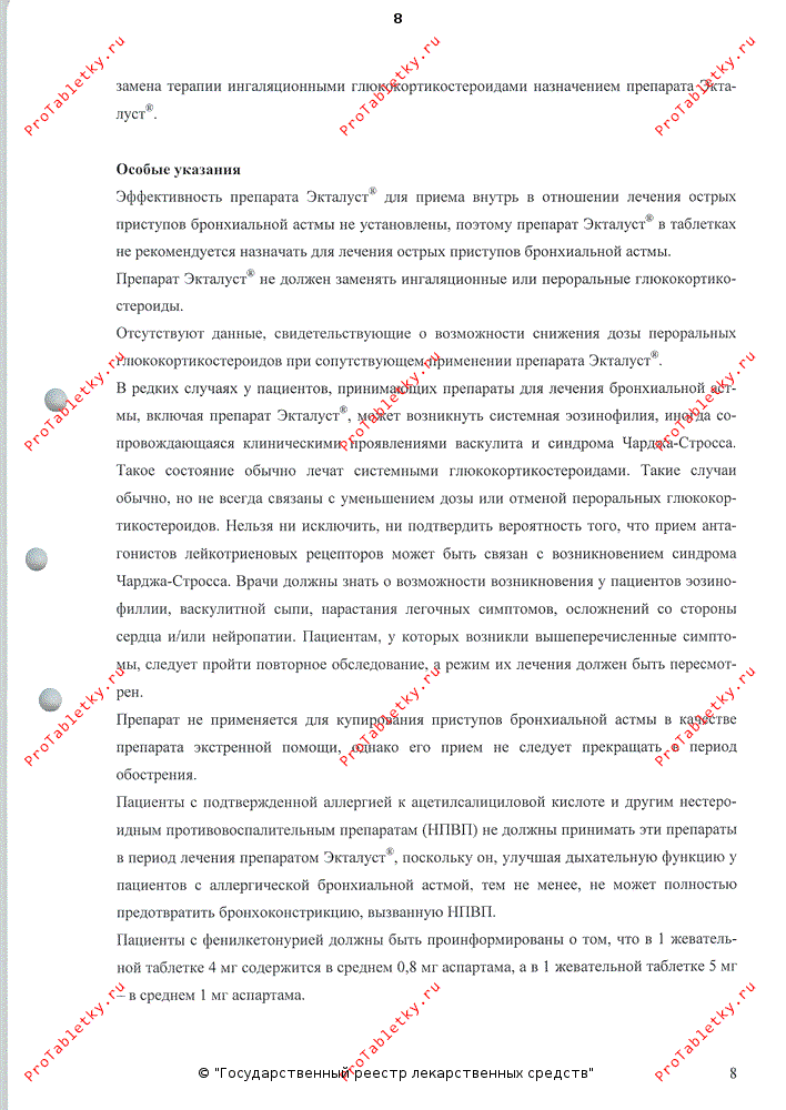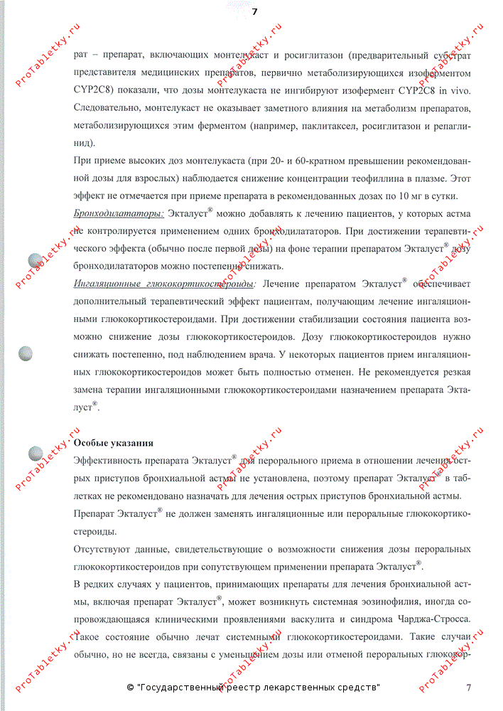 Отсутствуют данные, свидетельствующие о возможности снижения дозы пероральных ГКС при сопутствующем применении препарата Экталуст®. В редких случаях у пациентов, принимающих препараты для лечения бронхиальной астмы, включая препарат Экталуст®, может возникнуть системная эозинофилия, иногда сопровождающаяся клиническими проявлениями васкулита и синдрома Чарджа-Стросса. Такое состояние обычно лечат системными ГКС. Такие случаи обычно, но не всегда связаны с уменьшением дозы или отменой пероральных ГКС. Нельзя ни исключить, ни подтвердить вероятность того, что прием антагонистов лейкотриеновых рецепторов может быть связан с возникновением синдрома Чарджа-Стросса. Врачи должны знать о возможности возникновения у пациентов эозинофиллии, васкулитной сыпи, нарастания легочных симптомов, осложнений со стороны сердца и/или нейропатии. Пациентам, у которых возникли вышеперечисленные симптомы, следует пройти повторное обследование, а режим их лечения должен быть пересмотрен.