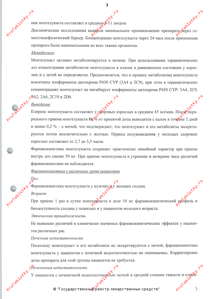 Фармакокинетика монтелукаста сохраняет практически линейный характер при приеме внутрь доз свыше 50 мг. При приеме монтелукаста в утренние и вечерние часы различий фармакокинетики не наблюдается.