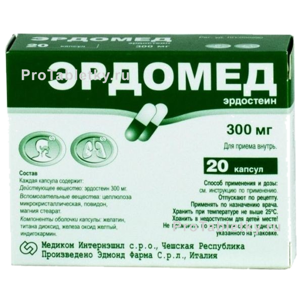 Эрдомед является новым препаратом, эффективность которого обусловлена действием активных метаболитов. Тиоловые группы метаболитов вызывают разрыв дисульфидных мостиков, которые связывают одно с другим волокна гликопротеинов, что приводит к уменьшению эластичности и вязкости мокроты. В результате эрдостеин усиливает и ускоряет освобождение респираторных путей от секрета, улучшает секреторную функцию эпителия и увеличивает эффективность мукоцилиарного транспорта в верхних и нижних отделах респираторного тракта.