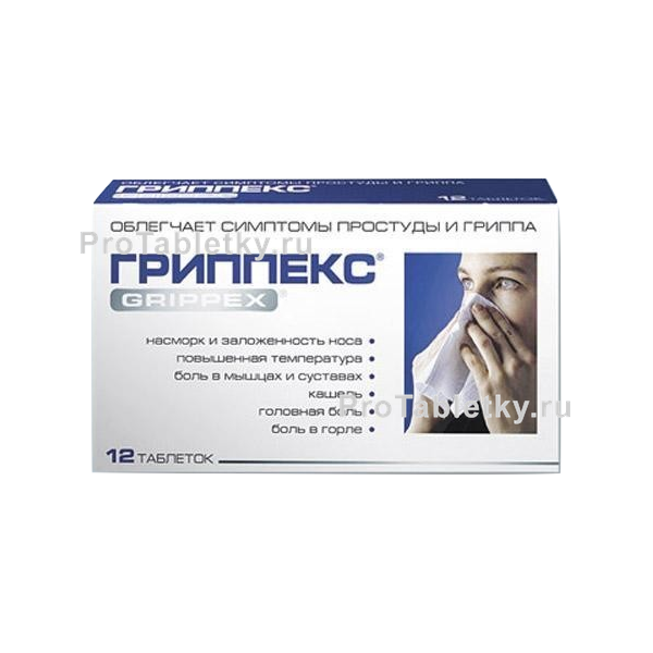 Таблетки Гриппекс® содержат парацетамол (анальгетик-антипиретик), псевдоэфедрин (симпатомиметик) и декстрометорфан (противокашлевое средство). Препарат облегчает выраженность симптомов, обычно сопровождающих "простудные" заболевания.
