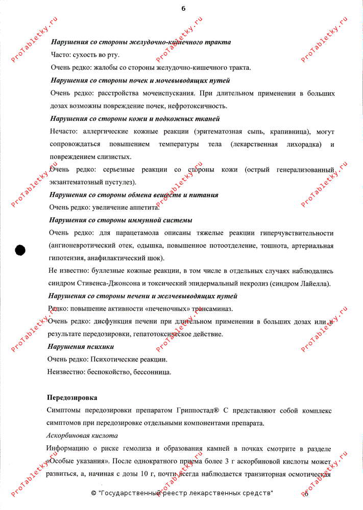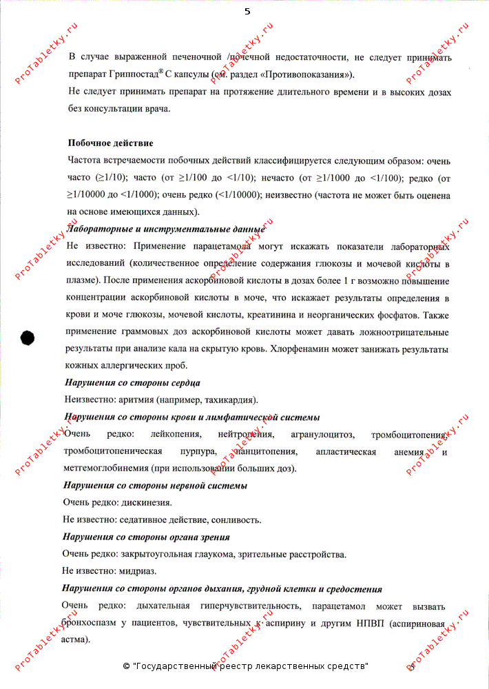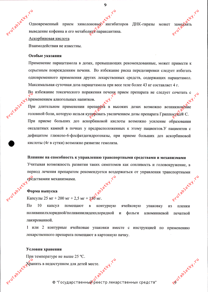 Аскорбиновая кислота, входящая в состав Гриппостад® С, искажает результаты лабораторных тестов, оценивающих концентрацию глюкозы и мочевой кислоты в плазме.