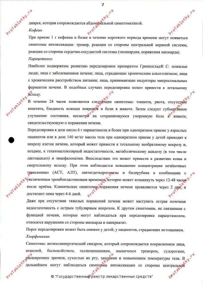 Симптомы (обусловлены парацетамолом): бледность кожных покровов, снижение аппетита, тошнота, рвота; гепатонекроз (выраженность некроза, вследствие интоксикации, прямо зависит от степени передозировки). Токсическое действие у взрослых возможно после приема свыше 10-15 г парацетамола: повышение активности печеночных трансаминаз, увеличение протромбинового времени (через 12-48 ч после приема); развернутая клиническая картина поражения печени проявляется через 1-6 дней. Редко печеночная недостаточность развивается молниеносно и может осложнятся почечной недостаточностью (тубулярный некроз).