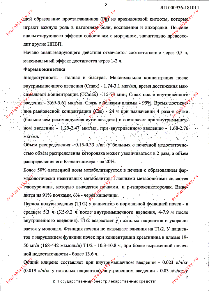 Более 50% введенной дозы метаболизируется в печени с образованием фармакологически неактивных метаболитов. Главными метаболитами являются глюкурониды, которые выводятся почками, и р-гидроксикеторолак. Выводится на 91% почками, 6% - через кишечник.