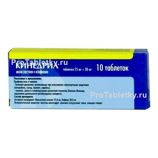 Фармакологическое действие препарата Кинедрил® обусловлено свойствами входящих в его состав действующих веществ — моксастина теоклата и кофеина. Действие препарата начинается через 10-15 мин и сохраняется до 2 ч.