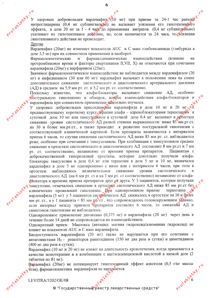 Исследования лекарственного взаимодействия Левитры проводились также у пациентов с доброкачественной гиперплазией предстательной железы (ДГПЖ), получающих стабильные дозы тамсулозина или теразозина. При назначении Левитры в дозах 5, 10 или 20 мг пациентам, получавшим стабильные дозы тамсулозина, дополнительного снижения среднего уровня АД не наблюдалось. При одномоментном приеме Левитры в дозе 5 мг и тамсулозина в дозе 0.4 мг у 2 из 21 пациента наблюдалась ортостатическая артериальная гипотензия с падением систолического АД ниже 85 мм рт. ст. При приеме Левитры в дозе 5 мг и тамсулозина с 6-часовым интервалом ортостатическая систолическая артериальная гипотензия с падением АД менее 85 мм рт. ст. развилась также у 2 из 21 пациента. В последующем исследовании одномоментное назначение Левитры в дозах 10 мг и 20 мг и тамсулозина в дозах 0.4 мг и 0.8 мг случаев ортостатического падения систолического АД ниже 85 мм рт. ст. зарегистрировано не было. При одномоментном назначении Левитры в дозе 5 мг и теразозина в дозах 5 мг или 10 мг у одного из 21 пациента наблюдалась симптоматическая постуральная гипотензия. При приеме Левитры в дозе 5 мг и теразозина с интервалом в 6 часов случаев падения АД не было. Полученные результаты следует принимать во внимание при решении вопроса о времени назначения препаратов.