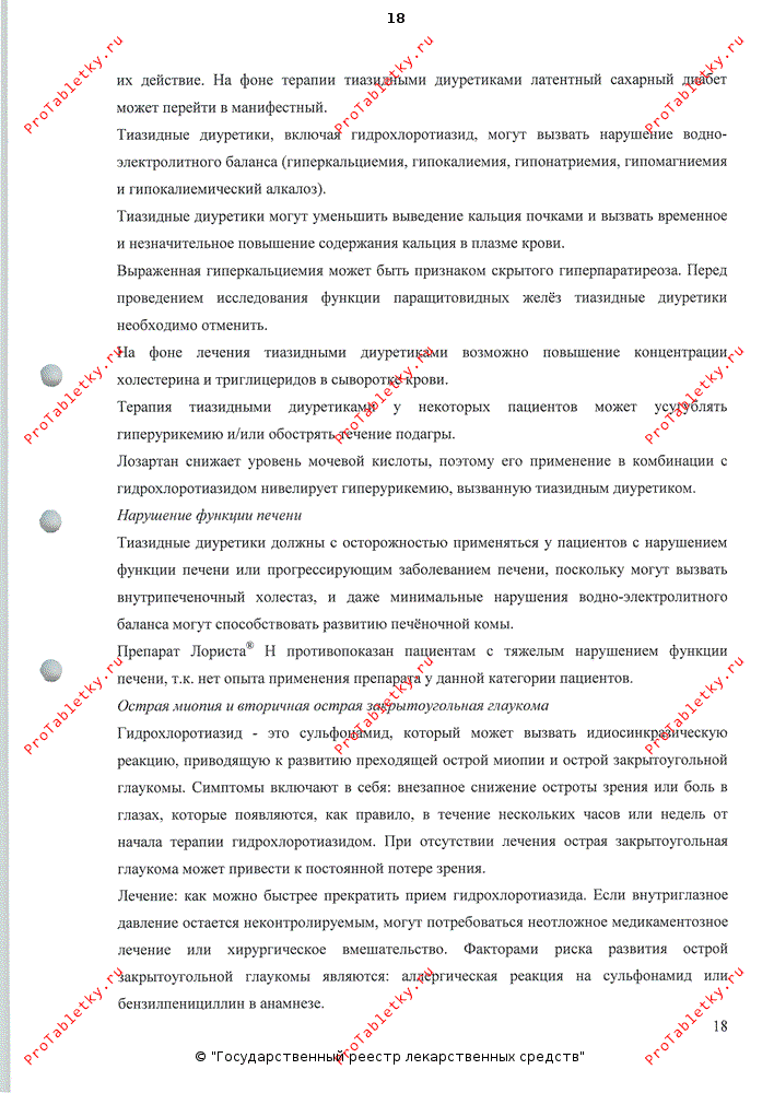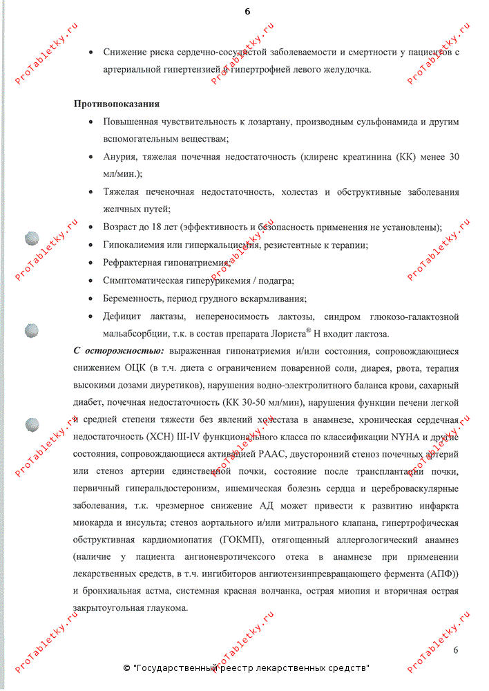 Лориста® Н содержит лактозу, поэтому препарат не назначают пациентам с дефицитом лактазы, галактоземией или синдромом мальабсорбции глюкозы/галактозы.