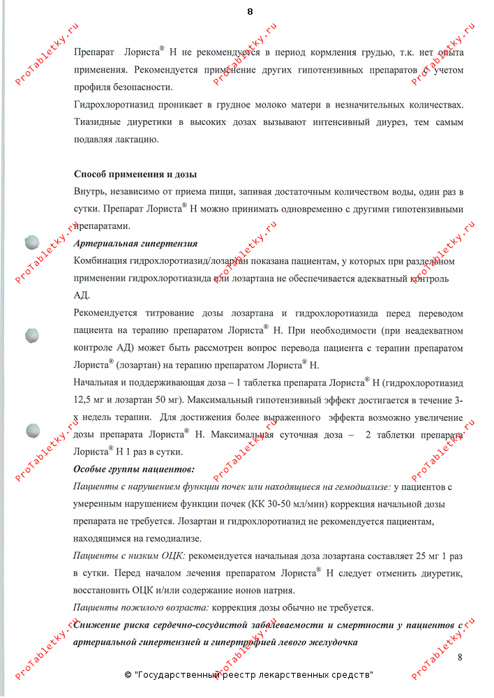 Для снижения риска сердечно-сосудистой заболеваемости и смертности у пациентов с артериальной гипертензией и гипертрофией левого желудочка стандартная начальная доза лозартана составляет 50 мг 1 раз/сут. Пациентам, у которых не удалось достичь целевого уровня АД на фоне приема лозартана 50 мг/сут, требуется подбор терапии путем комбинации лозартана с низкими дозами гидрохлоротиазида (12.5 мг), и, в случае необходимости, нужно увеличить дозу лозартана до 100 мг в сочетании с гидрохлоротиазидом в дозе 12.5 мг/сут, в дальнейшем - увеличить дозу Лористы Н до 2 таб. 1 раз/сут.