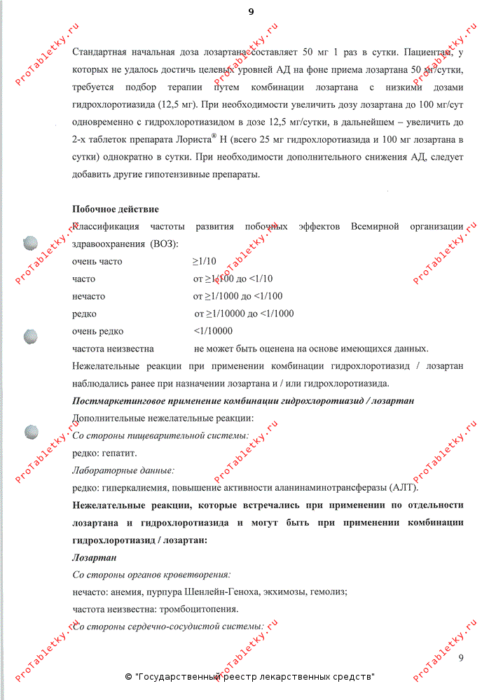 В результате препарат вызывает расслабление стенок кровеносных сосудов, снижает пред- и постнагрузку на миокард, общее периферическое сопротивление сосудов и предупреждает гипертрофию левого желудочка. В отличие от других антигипертензивных лекарственных средств, лориста Н обладает урикозурическим эффектом, не оказывает негативного влияния на эректильную функцию, проявляет противовоспалительные и антиагрегантные (противотромбические) свойства, улучшает когнитивные (познавательные) функции. Эффективность и благоприятный профиль безопасности лористы Н были подтверждены не только при клинических испытаниях, но и в ходе постмаркетинговых исследований, т.е. уже после выхода препарата на рынок. После приема внутрь лозартан быстро абсорбируется в желудочно-кишечном тракте. Его системная биодоступность составляет 33%, что связано с эффектом первого прохождения через печень. Пик концентрации лозартана в крови регистрируется через 1 час после приема. Лористу Н можно применять независимо от приема пищи. Второй компонент препарата -¬ тиазидный диуретик гидрохлоротиазид – препятствует обратному всасыванию в дистальном отделе нефрона ионов натрия, и хлора, а также воды и ионов калия, магния и кальция. Его антигипертензивное действие обусловлено расширением артериол. Диуретический эффект отмечается спустя 1-2 часа после приема препарата, достигает своего максимума спустя 4 часа и продолжается до 12 часов. Начальная (она же и поддерживающая) доза лористы Н при артериальной гипертензии составляет 1 таблетку 1 раз в сутки. Максимальный терапевтический эффект следует ожидать в течение первых 3 недель фармакотерапии. При недостаточной эффективности препарата эта доза может быть увеличена до 2 таблеток. Лориста Н хорошо сочетается с другими антигипертензивными препаратами. Пациентам пожилого возраста коррекция дозы не требуется. Наличие в составе препарата гидрохлоротиазида повышает риск артериальной гипотонии и нарушений водно-солевого баланса.