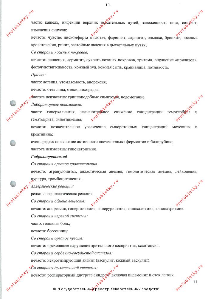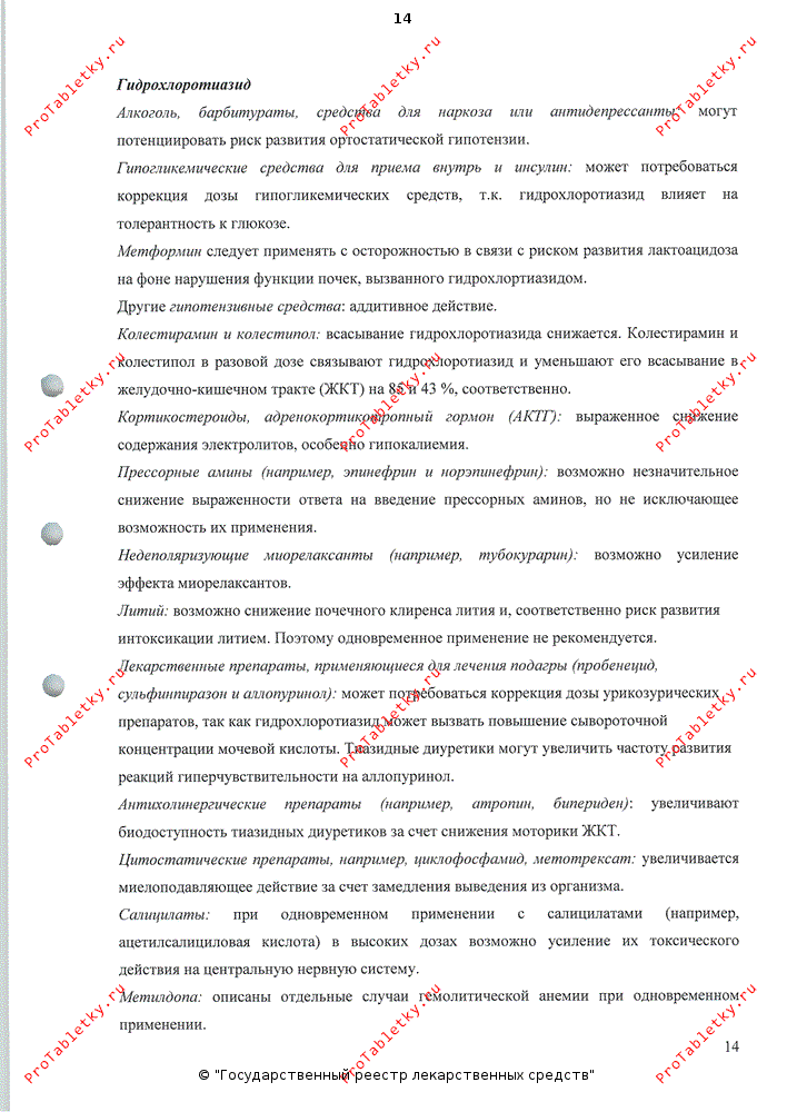 Гидрохлоротиазид может усилить артериальную гипотензию и нарушения водно-электролитного баланса (уменьшение ОЦК, гипонатриемию, гипохлоремический алкалоз, гипомагниемию, гипокалиемию), нарушать толерантность к глюкозе, снизить выведение кальция с мочой и вызывать преходящее, незначительное повышение концентрации кальция в плазме крови, повышать концентрацию холестерина и ТГ, провоцировать возникновение гиперурикемии и/или подагры.