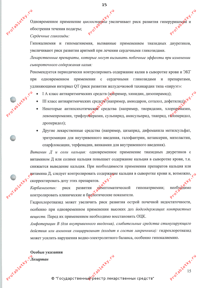 Сочетание лозартана с калийсберегающими диуретиками (спиронолактон, триамтерен, амилорид), калийсодержащими добавками или солями калия может приводить к гиперкалиемии.
