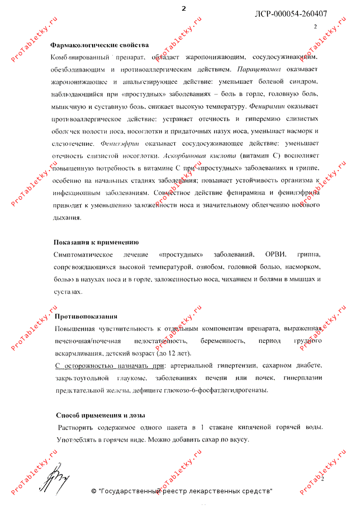 Один из самых любимых препаратов в лечении ОРВИ у взрослых и детей старше 15 лет. Значительно облегчает состояние, снимает отек слизистой носоглотки (фенилэфрин), снижает температуру (парацетамол). Кроме того содержит аскорбиновую кислоту, которая положительно влияет на течение болезни. Приятный вкус, что важно для пациентов, когда самочувствие и так не очень хорошее. Рекомендую принимать перед сном. | |||||||||