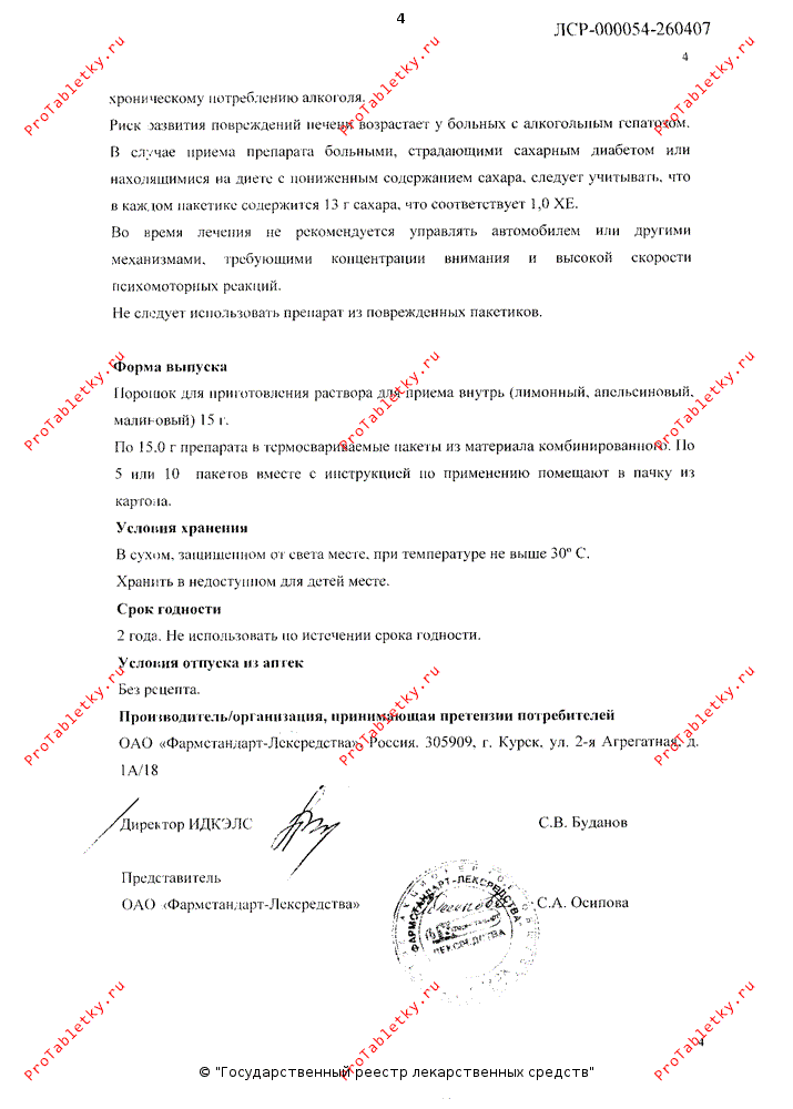 Пациентам с сахарным диабетом или пациентам, находящимся на диете с пониженным содержанием сахара, следует учитывать, что в каждом пакетике препарата содержится 13 г сахара, что соответствует 1.0 ХЕ.
