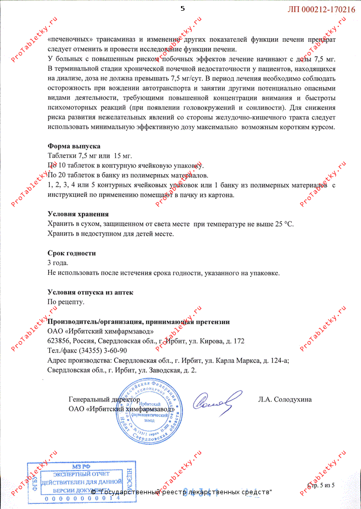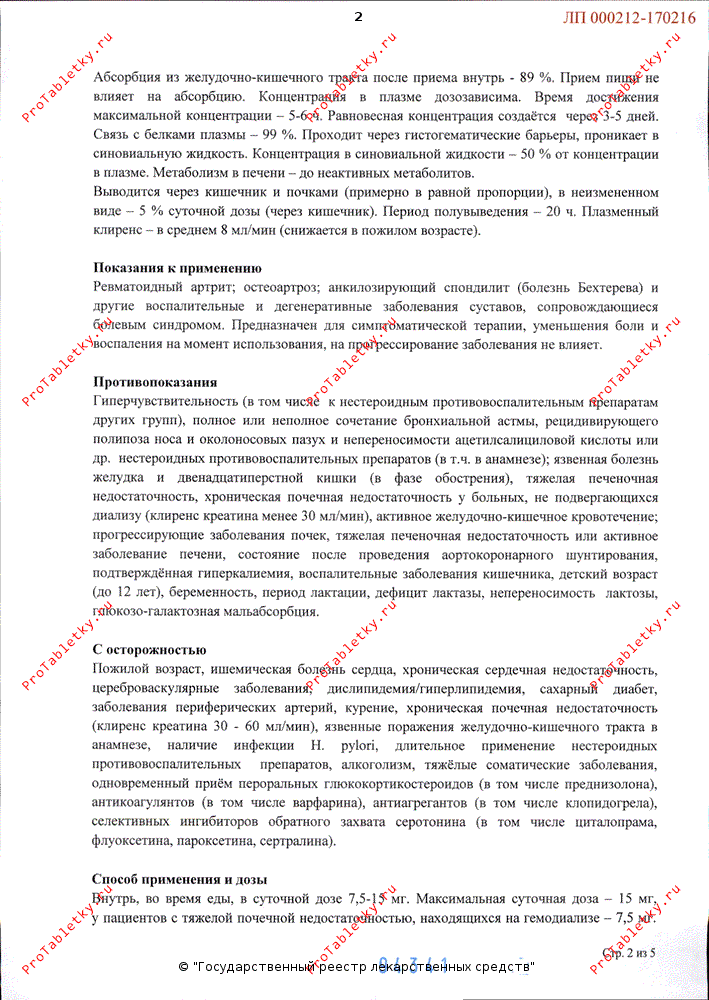 У больных с повышенным риском побочных эффектов лечение начинают с дозы 7.5 мг. В терминальной стадии хронической почечной недостаточности у пациентов, находящихся на диализе, доза не должна превышать 7.5 мг/сут. В период лечения необходимо соблюдать осторожность при вождении автотранспорта и занятии другими потенциально опасными видами деятельности, требующими повышенной концентрации внимания и быстроты психомоторных реакций (при появлении головокружений и сонливости). Для снижения риска развития нежелательных явлений со стороны ЖКТ следует использовать минимальную эффективную дозу максимально возможным коротким курсом.