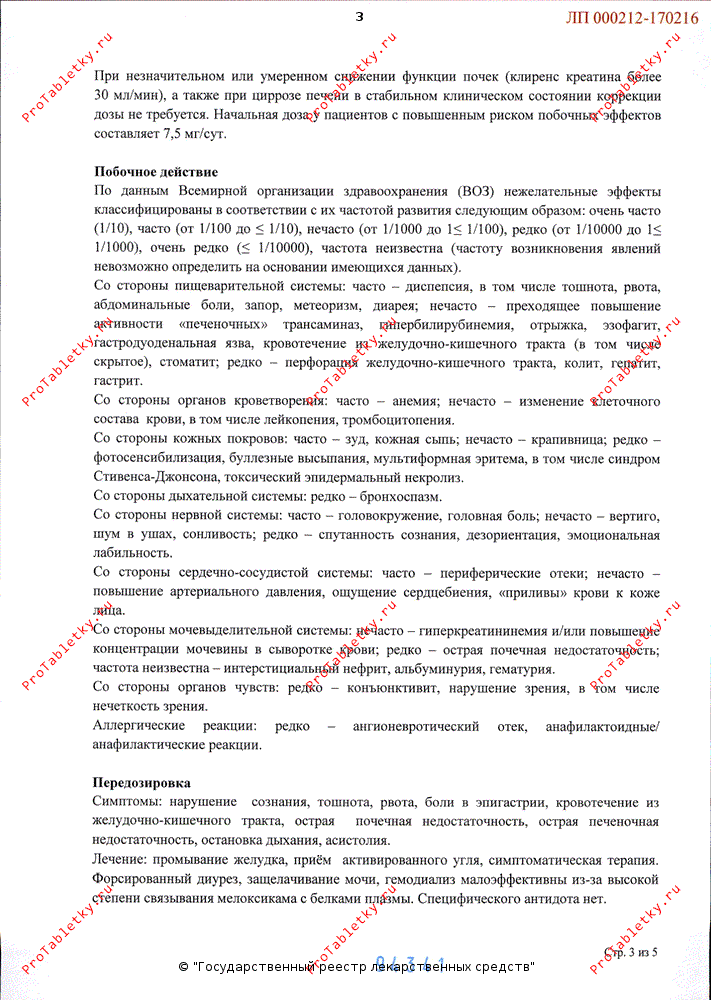 Со стороны мочевыделительной системы: 0.1-1% - гиперкреатининемия и/или повышение концентрации мочевины в сыворотке крови; менее 0.1% - острая почечная недостаточность; связь с приемом мелоксикама не установлена - интерстициальный нефрит, альбуминурия, гематурия.
