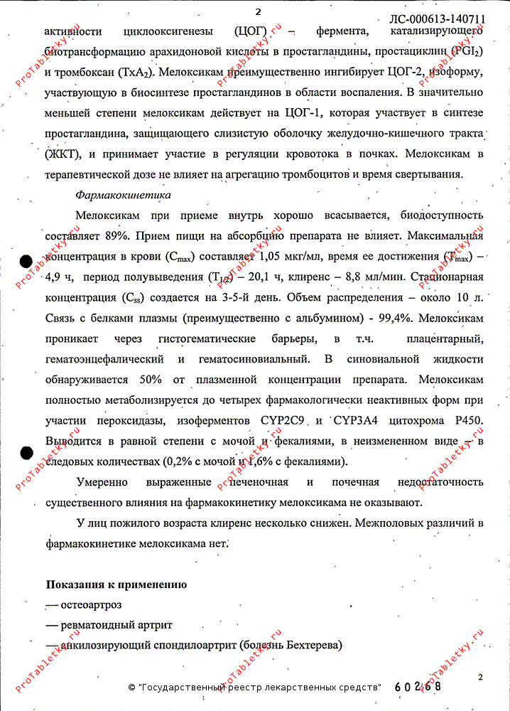 Равновесное состояние достигается в течение 3-5 дней регулярного приема. При длительном (более 1 года) применении препарата величина концентрации мелоксикама сходна с Css, которая установилась после первых дней приема препарата. Связывание с белками плазмы составляет более 99%. При приеме препарата 1 раз/сут Cssmin и Cssmax отличаются в небольшой степени и составляют при приеме в дозе 7.5 мг 1 раз/сут 0.4-1.0 мкг/мл, а при приеме в дозе 15 мг 1 раз/сут – 0.8-2.0 мкг/мл соответственно. Мелоксикам проникает через гистогематические барьеры, концентрация в синовиальной жидкости достигает 50% Cmax в плазме. Vd составляет в среднем 11 л.