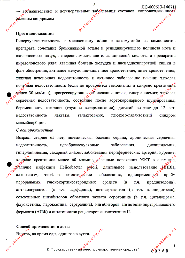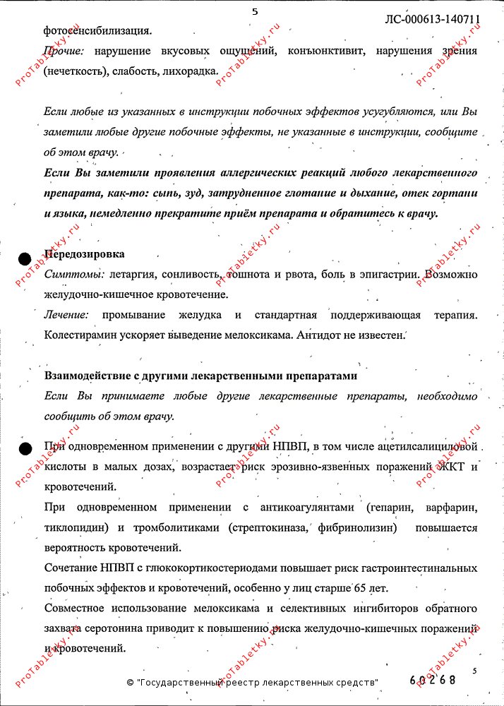 Лечение: промывание желудка, прием активированного угля (в течение 1 ч после приема препарата); при необходимости проводят симптоматическую терапию. Колестирамин ускоряет выведение мелоксикама из организма. Форсированный диурез, защелачивание мочи, гемодиализ малоэффективны из-за высокой степени связывания мелоксикама с белками крови. Специфического антидота нет.
