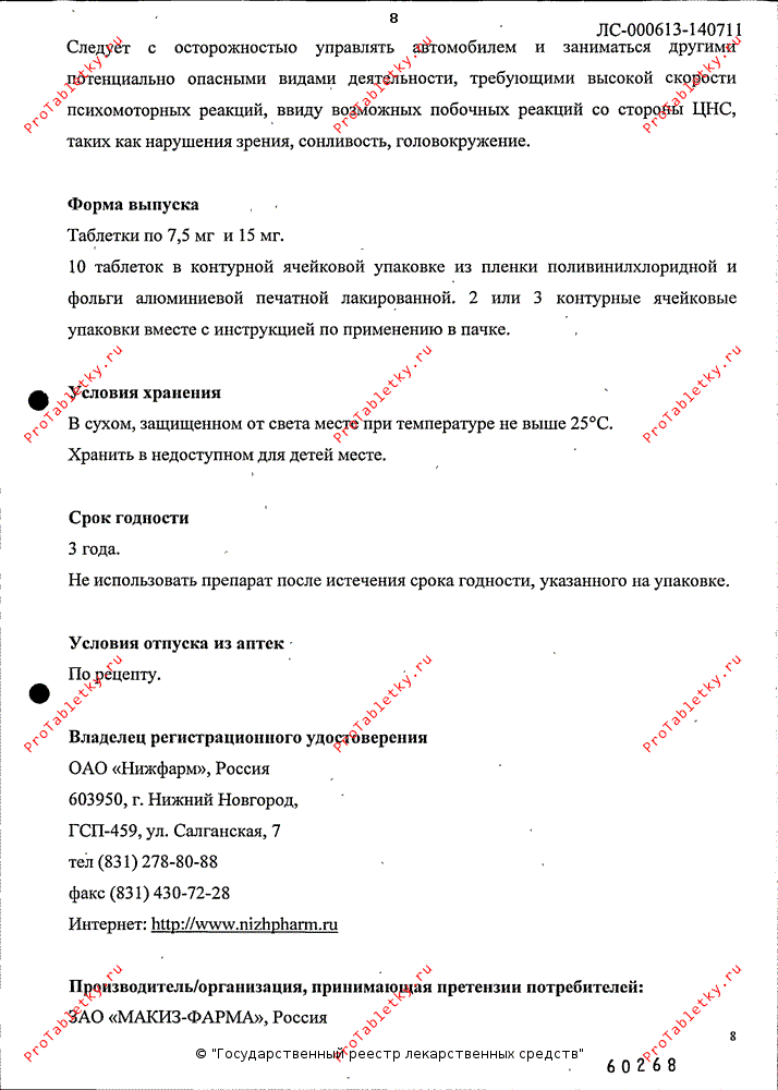 Вспомогательные вещества: целлюлоза микрокристаллическая, лактоза, кремния диоксид коллоидный (аэросил), кроскармеллоза натрия, тальк, магния стеарат.