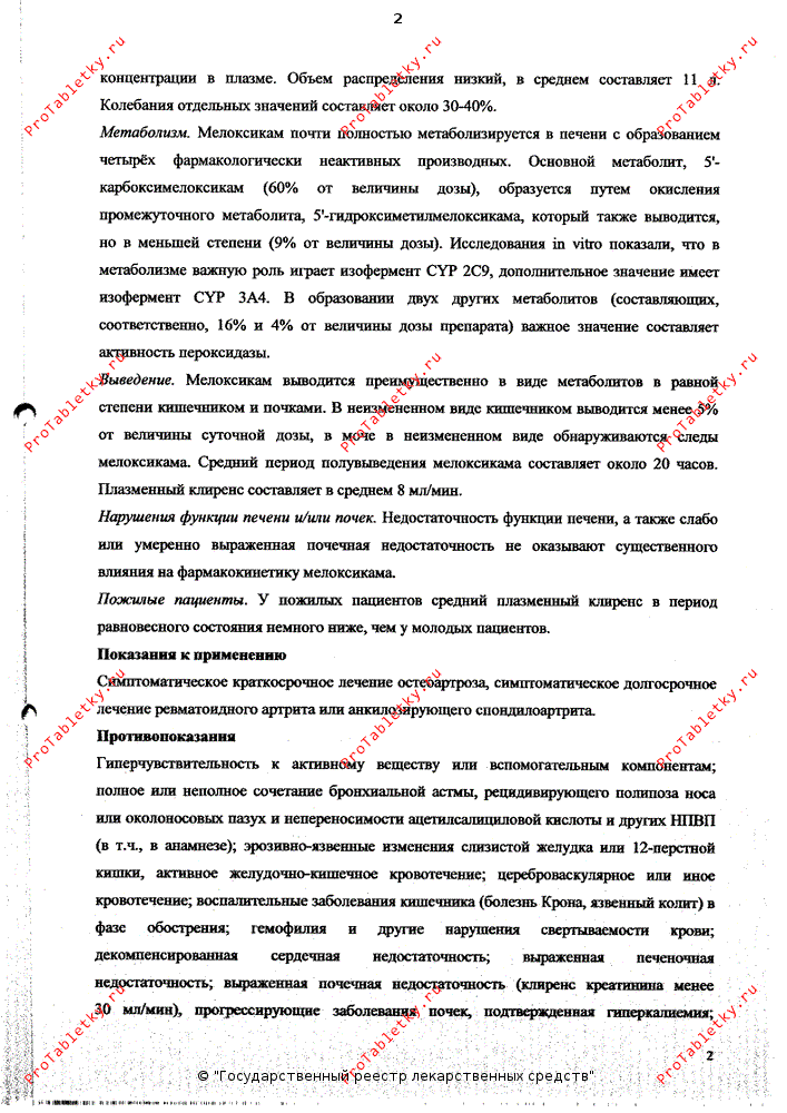 Концентрация мелоксикама в синовиальной жидкости составляет 50% от концентрации в плазме крови.