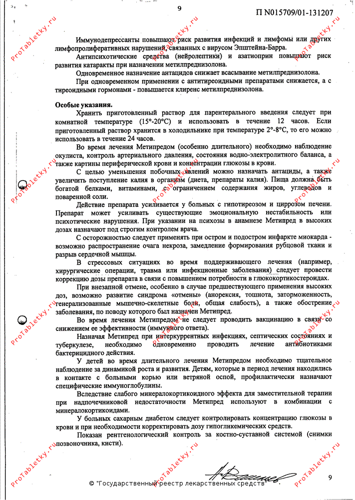 Этот препарат спас не одну жизнь. В случае тяжёлого поражения внутренних органов, ревматических заболеваний, угрожающих серьёзными осложнениями, он незаменим. Плохо, когда этот препарат назначают не по делу. При длительном приёме могут появляться побочные эффекты, которые требуют коррекции. Любой препарат должен назначаться по показаниям, это вдвойне относится к "Метипреду". Общая идея - он должен использоваться в минимально необходимой дозе. Иногда требуется постоянное лечение, например, при поражении почек, лёгких и других органов. Нежелательно его длительное использование при артритах, например, ревматоидном (за редкими исключениями). Необходимо посоветоваться с врачом о профилактике его нежелательных эффектов, если требуется длительная терапия. | |||||||||