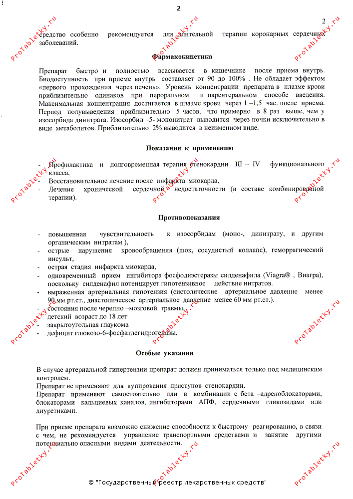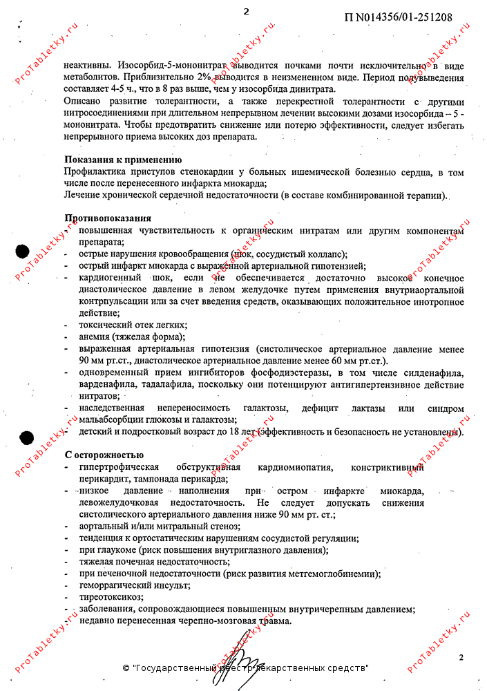 неактивны. Изосорбид-5-мононитрат выводится почками почти исключительно в виде метаболитов. Приблизительно 2% выводится в неизмененном виде. Период полувыведения составляет 4-5 ч., что в 8 раз выше, чем у изосорбида динитрата.