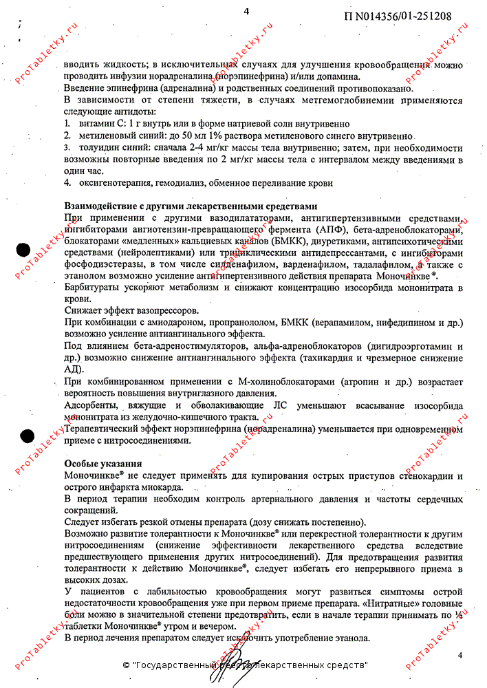 Возможно развитие толерантности к Моночинкве® или перекрестной толерантности к другим нитросоединениям (снижение эффективности лекарственного средства вследствие предшествующего применения других нитросоединений). Для предотвращения развития толерантности к действию Моночинкве® следует избегать его непрерывного приема в высоких дозах.