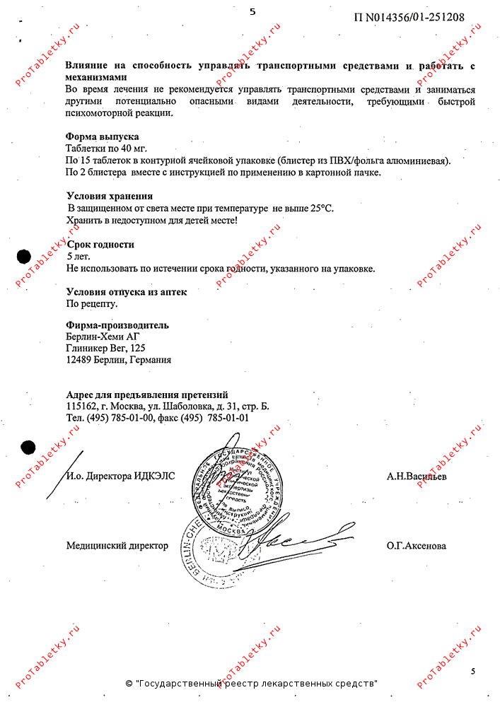 Частота приема и длительность лечения устанавливаются индивидуально. Начинать терапию целесоообразно с дозы 20 мг (1/2 таб.) 2 раза/сут. Затем постепенно повышать дозу до терапевтической - 40 мг (1 таб.) на прием 2-3 раза/сут с интервалом 7-8 ч. Максимальная суточная доза составляет 120 мг.