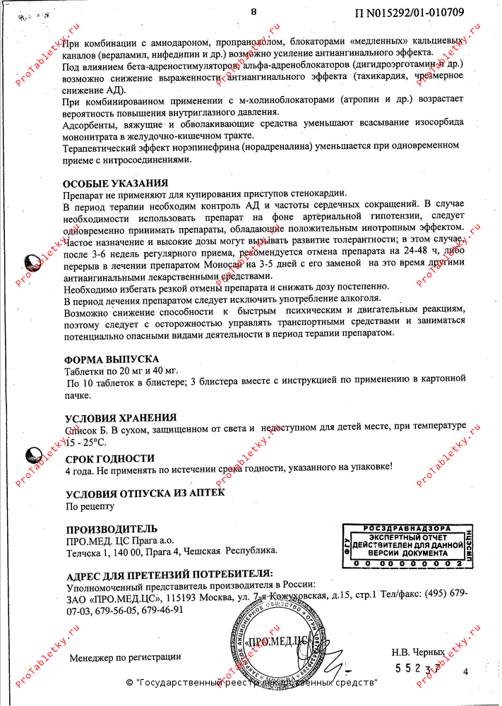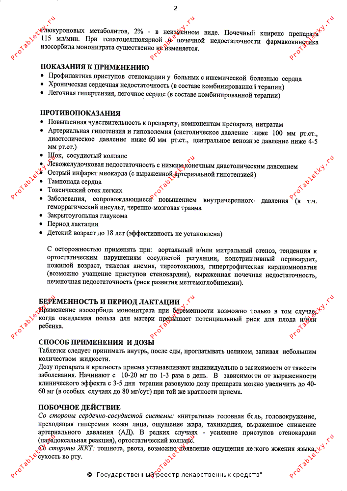 Как и к другим нитратам, к препарату развивается перекрестная толерантность. После отмены (перерыва в лечении) чувствительность к препарату быстро восстанавливается. Антиангинальный эффект развивается через 30-45 мин после приема препарата и продолжается до 8-10 ч.