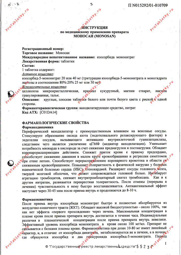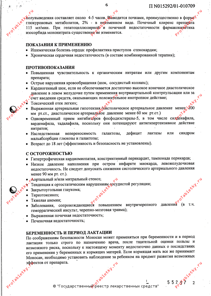 Метаболизм моносана происходит в почках, а не в печени. У лиц, страдающих гепатоцеллюлярной недостаточностью, в крови обнаруживается чрезмерно высокое содержание изосорбида динитрата рекомендованных доз. Если же говорить об изосорбиде мононитрате, то почечная или печеночная недостаточность практически не сказываются на его фармакокинетических свойствах, что позволяет применять его у лиц с подобной патологией. Период полужизни изосорбида мононитрата более длителен, нежели у динитрата, что позволяет использовать моносан в меньших дозах, снижая тем самым риск развития побочных эффектов. Режим дозирования моносана устанавливается в индивидуальном порядке в зависимости от степени тяжести заболевания. По общим рекомендациям начальная доза препарата составляет 10-20 мг 1-3 раза в день. В зависимости от силы терапевтического ответа с 3-5 дня лечения разовую дозу можно увеличить до 40-60 мг, сохранив прежнюю кратность приема. В любом случае не следует превышать суточный максимум в 80 мг. Препарат принимают после еды, проглатывая таблетку и запивая ее достаточным количеством воды. Моносан не используется при стенокардических приступах. Во время лечения необходимо контролировать артериальное давление и частоту сердечных сокращений. При использовании моносана у пациентов с артериальной гипертензией, следует одновременно назначать препараты, увеличивающие силу сердечных сокращений. Длительный прием моносана в субмаксимальных дозах может привести к снижению его эффективности. В таких случаях рекомендуется временная отмена препарата на 1-2 дня или его замена на другой антиангинальный препарат. При необходимости прекратить лечение принимаемая доза моносана снижается плавно, чтобы избежать синдрома отмены. Комбинирование препарата с лекарственными средствами, обладающими адсорбирующими, обволакивающими и вяжущими свойствами, способно отсрочить начало его действия.