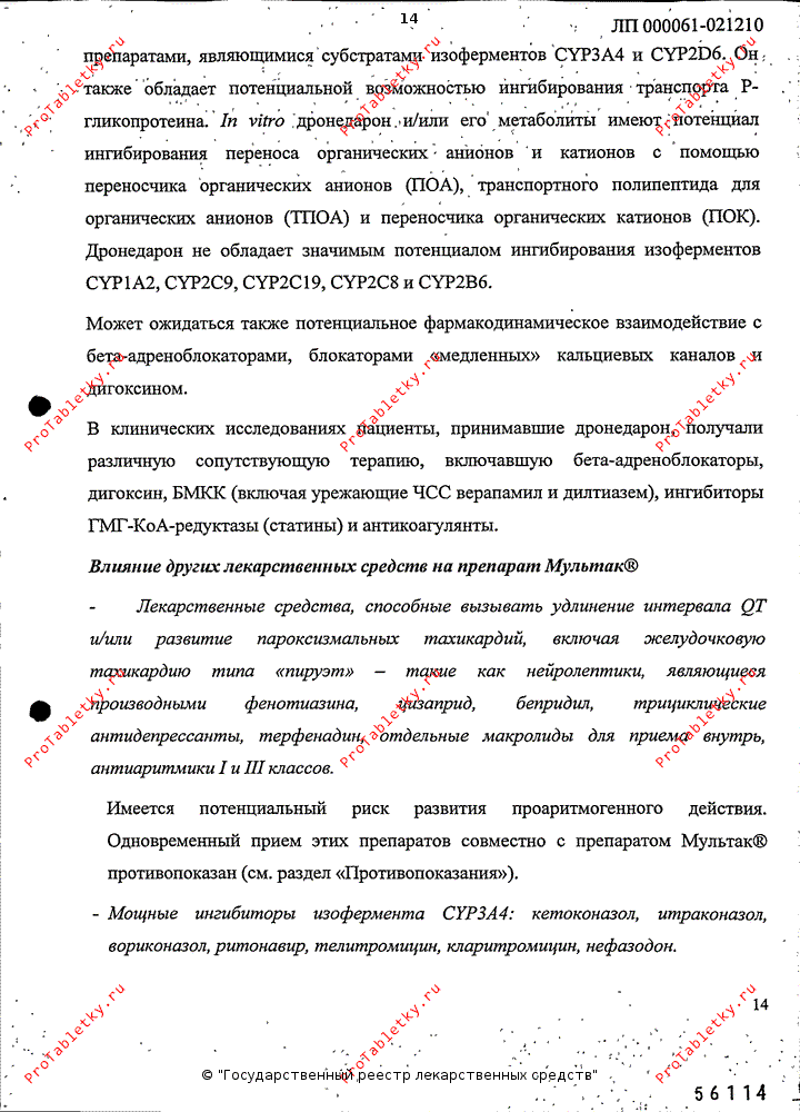 Фармакологическое действие дронедарона может вызывать изменения на ЭКГ, такие как умеренное удлинение интервала QT (связанное с удлинением периода реполяризации). Эти изменения связаны с терапевтическим действием дронедарона и не являются признаком токсического действия. Во время лечения препаратом Мультак рекомендовано наблюдение, включающее контроль ЭКГ. При продолжительности интервала QTc ≥ 500 мс прием дронедарона должен быть прекращен (см. раздел «Противопоказания»).