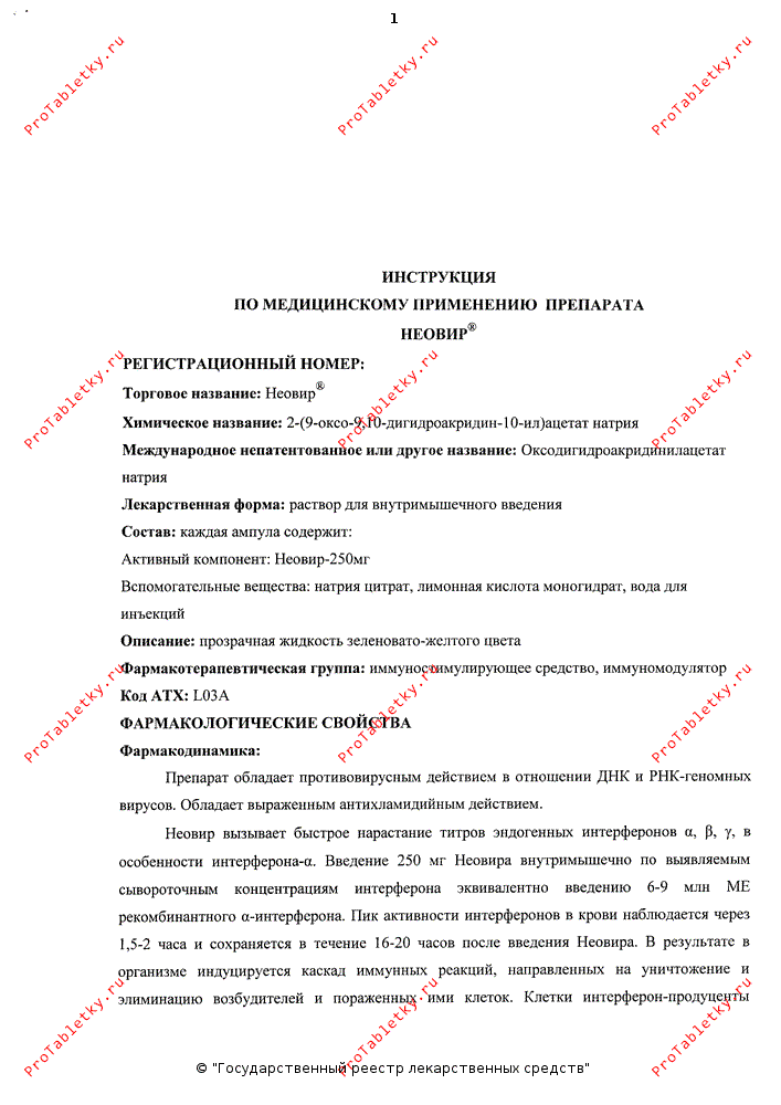 Отечественное (что отнюдь не является синонимом слову «бесполезное» или «некачественное»: пора избавляться от подобных стереотипов) лекарственное средство неовир представляет собой иммуностимулирующий препарат, в основе которого лежит действующее вещество с труднопроизносимым названием оксодигидроакридинилацетат натрия. Неовир проявляет противовирусный эффект, направленный на ДНК- и РНК-геномные вирусы, а также обладает мощным противохламидийным действием. Механизм действия препарата обусловлен его способностью стимулировать в организме синтез эндогенных интерферонов, в первую очередь — интерферона альфа.