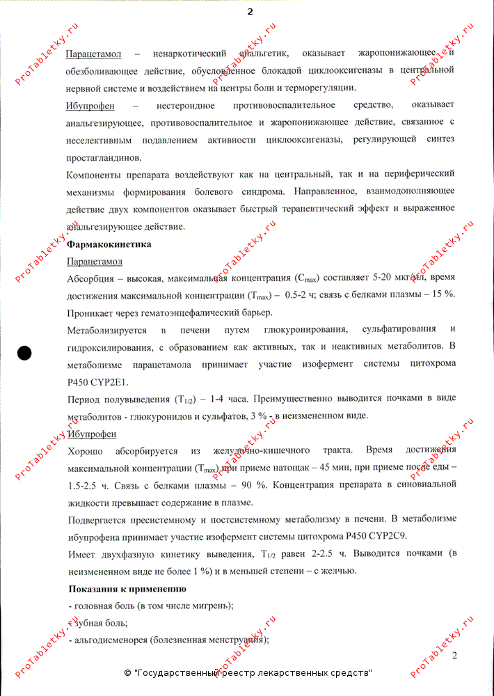 Отличный комбинированный обезболивающий препарат. Способствует быстрому стиханию болевых ощущений и препятствует развитию воспалительного процесса. Действовать начинает быстро, через 15-30 минут. Анальгезирующее и жаропонижающее действие препарата сохраняется до 5–8 часов. Применять строго по инструкции, но не более 3-5 дней. Дозировка ибупрофена 400 мг и сочетание с парацетамолом даёт более эффективный и продолжительный результат. | |||||||||