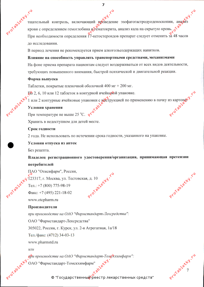 Достойный комбинированный препарат на основе ибупрофена+парацетамола. Получаю положительный отклик от пациентов в лечении при его назначении. Хорошо подходит для эпизодического приема при острой боли, оказывая обезболивающий эффект, также хорош с целью снижения температуры тела. Самостоятельное использование без назначения врача не рекомендую. | |||||||||