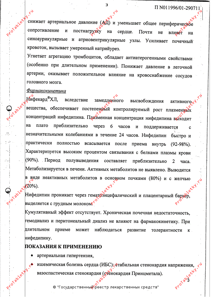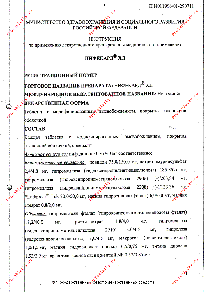 После перорального приема нифекард ХЛ практически в полном объеме (92-98%) абсорбируется в желудочно-кишечном тракте. Замедленное высвобождение действующего вещества обеспечивает плавный рост и последующую стабильность концентрации нифедипина в плазме крови. Препарат принимается 1 раз в сутки. Стандартная «стартовая» доза нифекарда ХЛ составляет 30 мг. При необходимости е можно постепенно. с 1-2-недельными интервалами, увеличить до допустимого максимума в 90 мг.