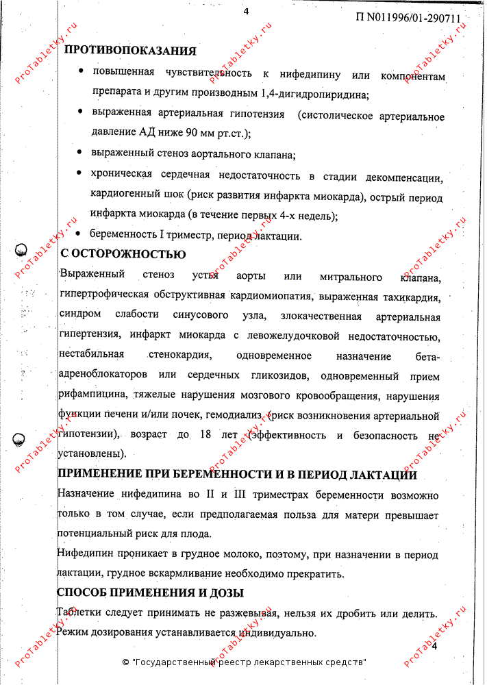 Адекватных и строго контролируемых исследований безопасности нифедипина при беременности не проводилось. Применение нифедипина при беременности не рекомендуется.