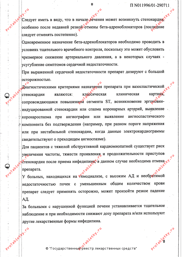 При нарушениях функции почек Нифедипин следует применять только в условиях клиники под строгим контролем врача. У больных с нарушениями функции почек следует избегать применения нифедипина в высоких дозах.Особые указания