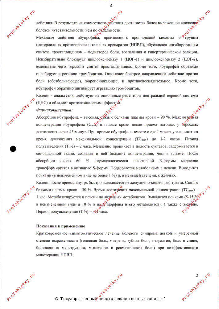 Ибупрофен и кодеин отличаются по механизму и месту действия. В результате их совместного действия достигается более выраженное снижение болевой чувствительности, чем по отдельности.