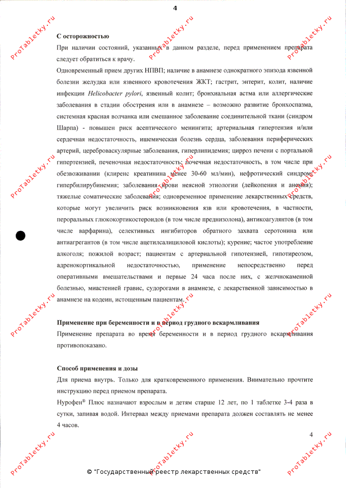 Пиковая концентрация в крови отмечается уже через 1 час после приема. Подвергается метаболическим трансформациям в печени с образованием фармакологически активных метаболитов. Период полужизни – 3-4 часа. Нурофен Плюс не предназначен для продолжительного (курсового) использования. Максимальная продолжительность лечения не должна превышать 3 дней. Разовая доза – 1 таблетка (при выраженном болевом синдроме – 2 таблетки). Допустимая кратность применения – 3-4 раза в день (при разовой дозе 2 таблетки максимальная кратность применения – 3 раза в день). В педиатрической практике препарат допускается использовать, начиная с 12-летнего возраста. Если использование Нурофена Плюс не вызывает устранение болевого синдрома, следует прервать его прием и обратиться за медицинской консультацией для уточнения диагноза и внесения изменений в лечение. Кратковременный прием лекарственного средства в минимальной эффективной дозе достаточной, для купирования боли, позволяет свести к минимуму возможные побочные эффекты. У пожилых лиц при приеме НПВС возрастает риск открытия кровотечений и возникновения перфораций в ЖКТ. В целом вероятность развития побочных эффектов зависит от дозы и продолжительности приема препарата. При приеме препарата в течение 3 и более дней необходимо отслеживать показатели периферической крови, функциональной активности печени и почек. Во время приема Нурофена Плюс следует воздерживаться от употребления алкоголя и других этанолсодержащих продуктов. Лицам с недостаточностью функции почек и/или страдающим артериальной гипертензией перед началом лечения необходимо обратиться за медицинской консультацией.