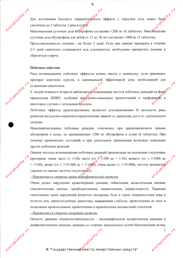Нижеперечисленные побочные реакции отмечались при кратковременном приеме ибупрофена в дозах, не превышающих 1200 мг ибупрофена в сутки (6 таб.). При лечении хронических состояний и при длительном применении возможно появление других побочных реакций.