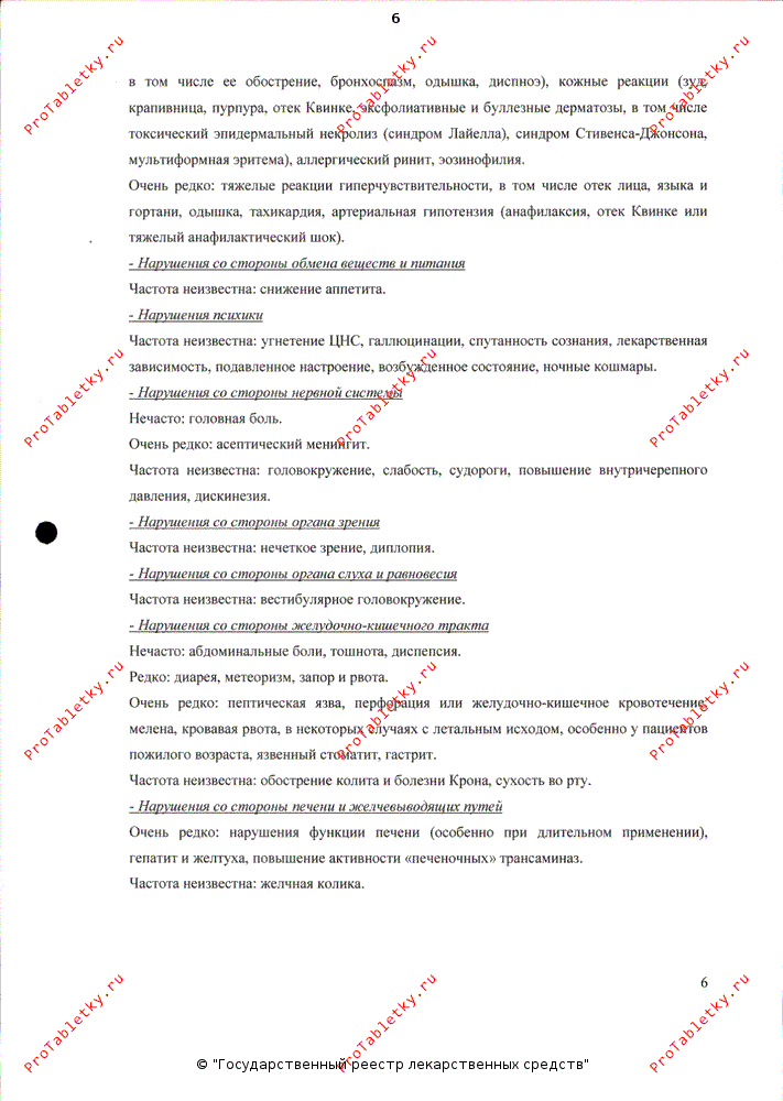 Со стороны иммунной системы: нечасто - реакции гиперчувствительности (неспецифические аллергические реакции и анафилактические реакции), реакции со стороны дыхательных путей (бронхиальная астма, в т.ч. ее обострение, бронхоспазм, одышка, диспноэ), кожные реакции (зуд, крапивница, пурпура, отек Квинке, эксфолиативные и буллезные дерматозы, в т.ч. токсический эпидермальный некролиз (синдром Лайелла), синдром Стивенса-Джонсона, многоформная эритема), аллергический ринит, эозинофилия; очень редко - тяжелые реакции гиперчувствительности, в т.ч. отек лица, языка и гортани, одышка, тахикардия, артериальная гипотензия (анафилаксия, отек Квинке или тяжелый анафилактический шок).