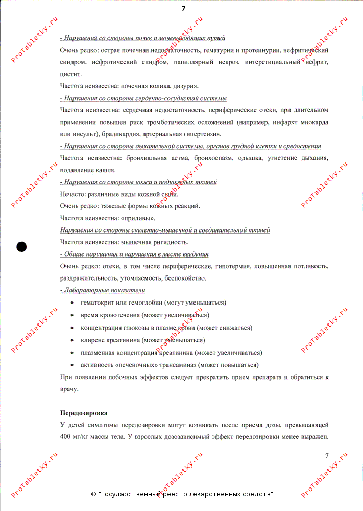 Лабораторные показатели: гематокрит или гемоглобин могут уменьшаться; время кровотечения может увеличиваться; концентрация глюкозы в плазме крови может снижаться; клиренс креатинина может уменьшаться; плазменная концентрация креатинина может увеличиваться; активность печеночных трансаминаз может повышаться.