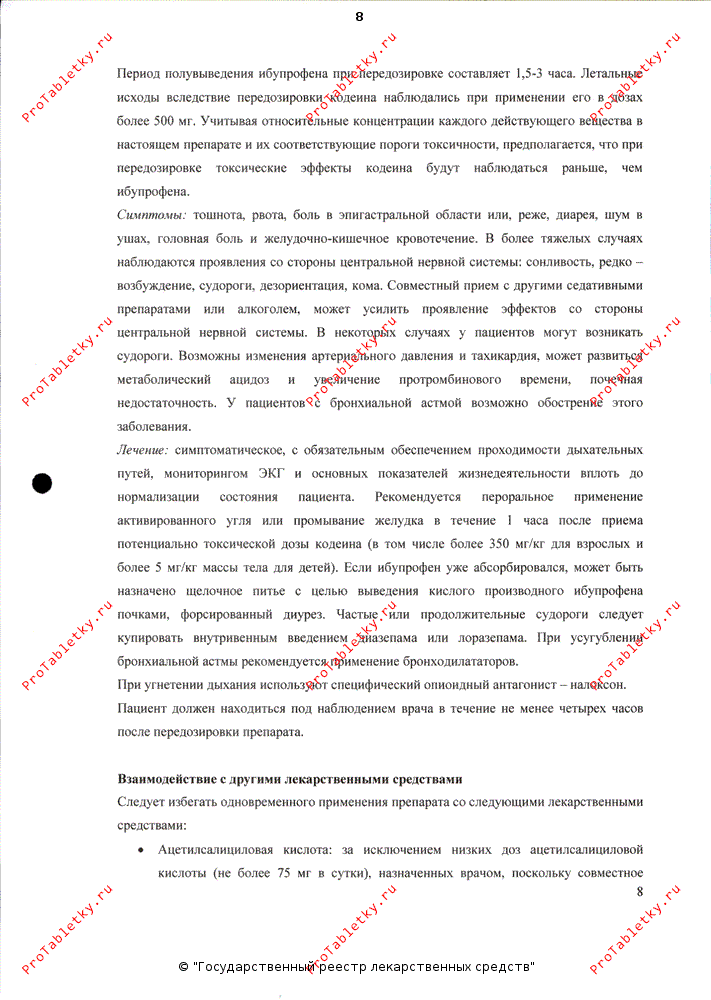 Лечение: симптоматическое, с обязательным обеспечением проходимости дыхательных путей, мониторингом ЭКГ и основных показателей жизнедеятельности вплоть до нормализации состояния пациента. Рекомендуется пероральное применение активированного угля или промывание желудка в течение 1 ч после приема потенциально токсической дозы кодеина (в т.ч. более 350 мг/кг для взрослых и более 5 мг/кг массы тела для детей). Если ибупрофен уже абсорбировался, может быть назначено щелочное питье с целью выведения кислого производного ибупрофена почками, форсированный диурез. Частые или продолжительные судороги следует купировать в/в введением диазепама или лоразепама. При усугублении бронхиальной астмы рекомендуется применение бронходилататоров. При угнетении дыхания применяют специфический опиоидный антагонист – налоксон.